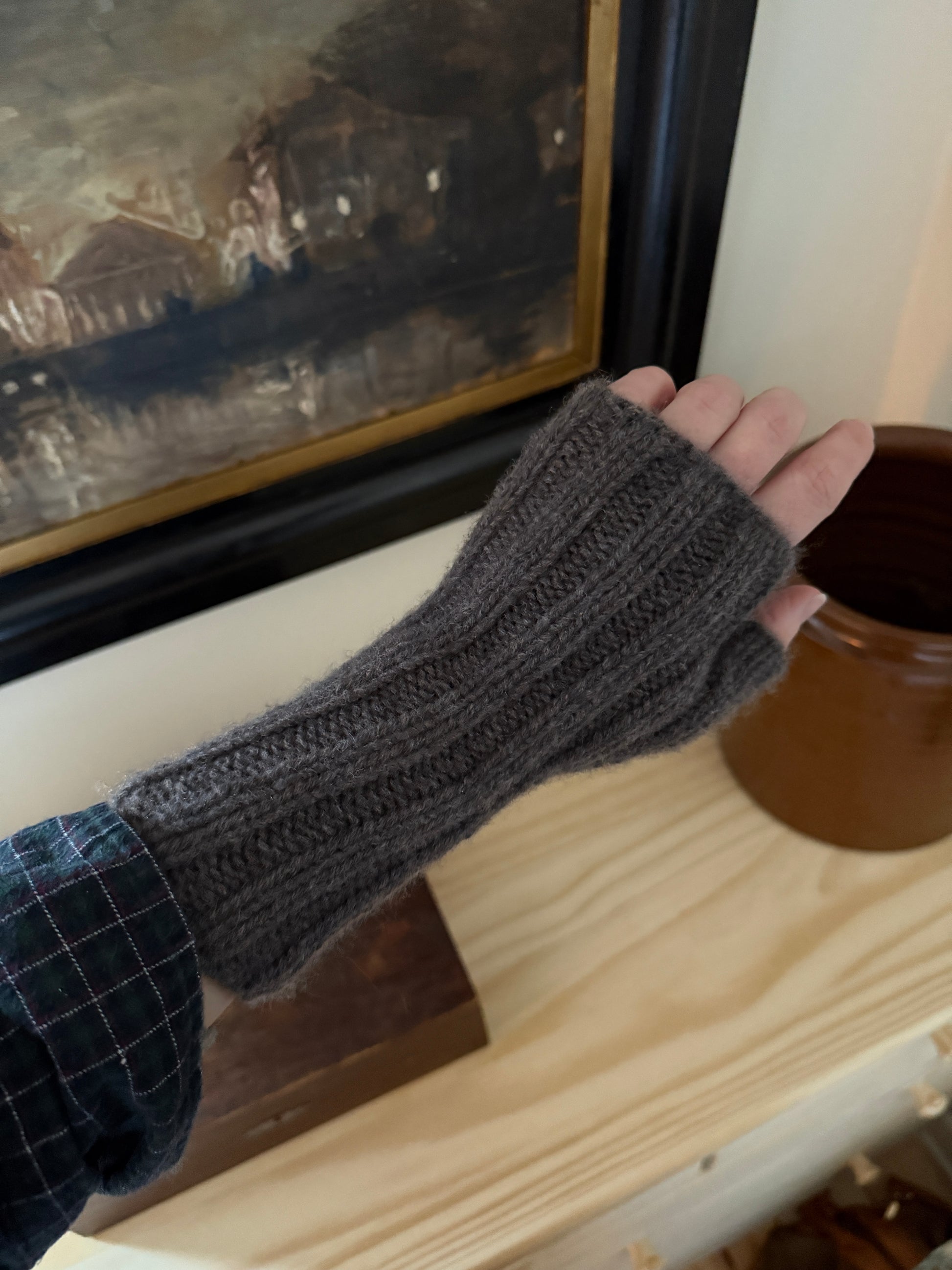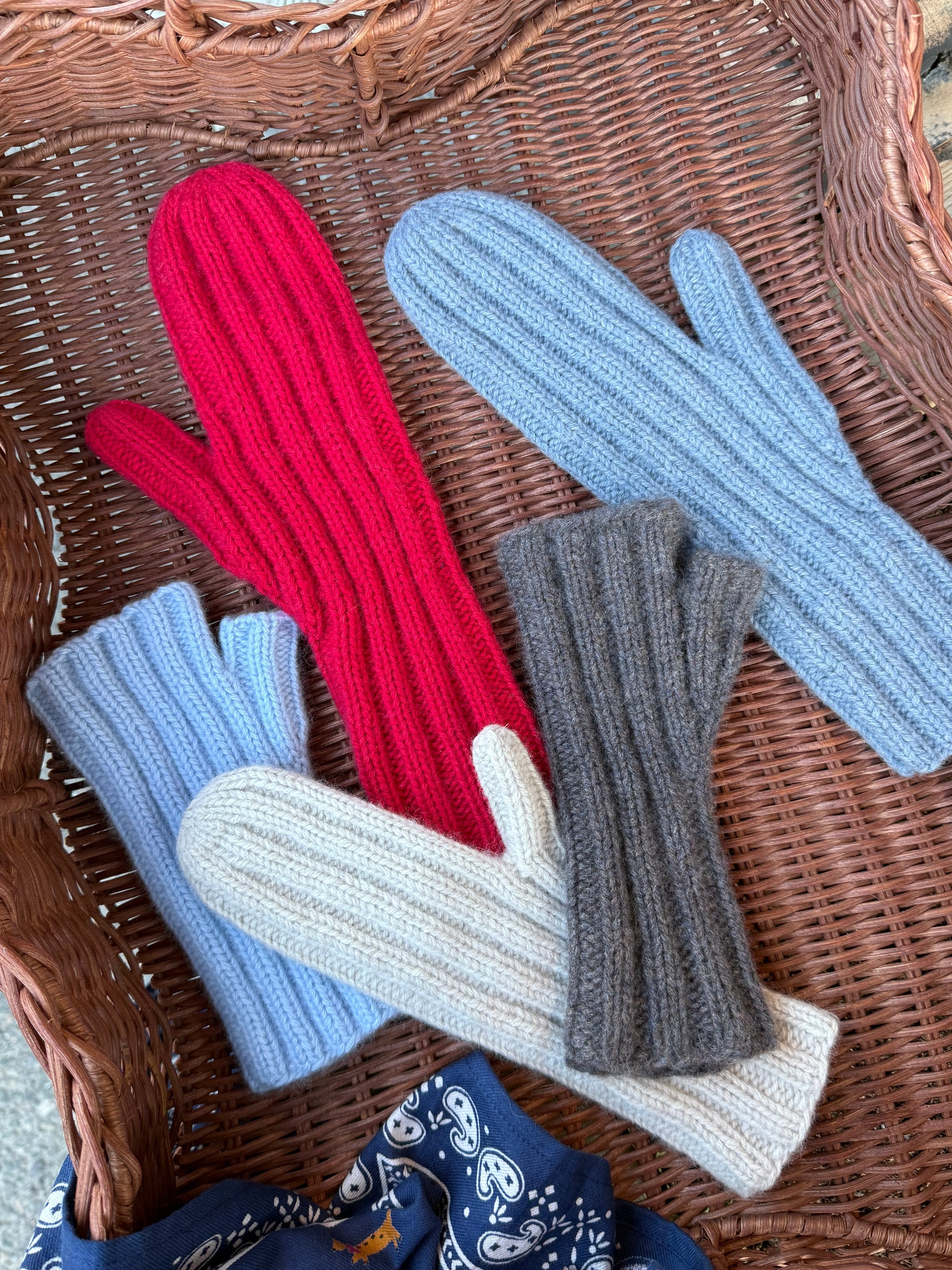 Holm vantene strikkes i dobbel ribb (2 r, 2 vr). De strikkes fra armen og ut mot fingrene.