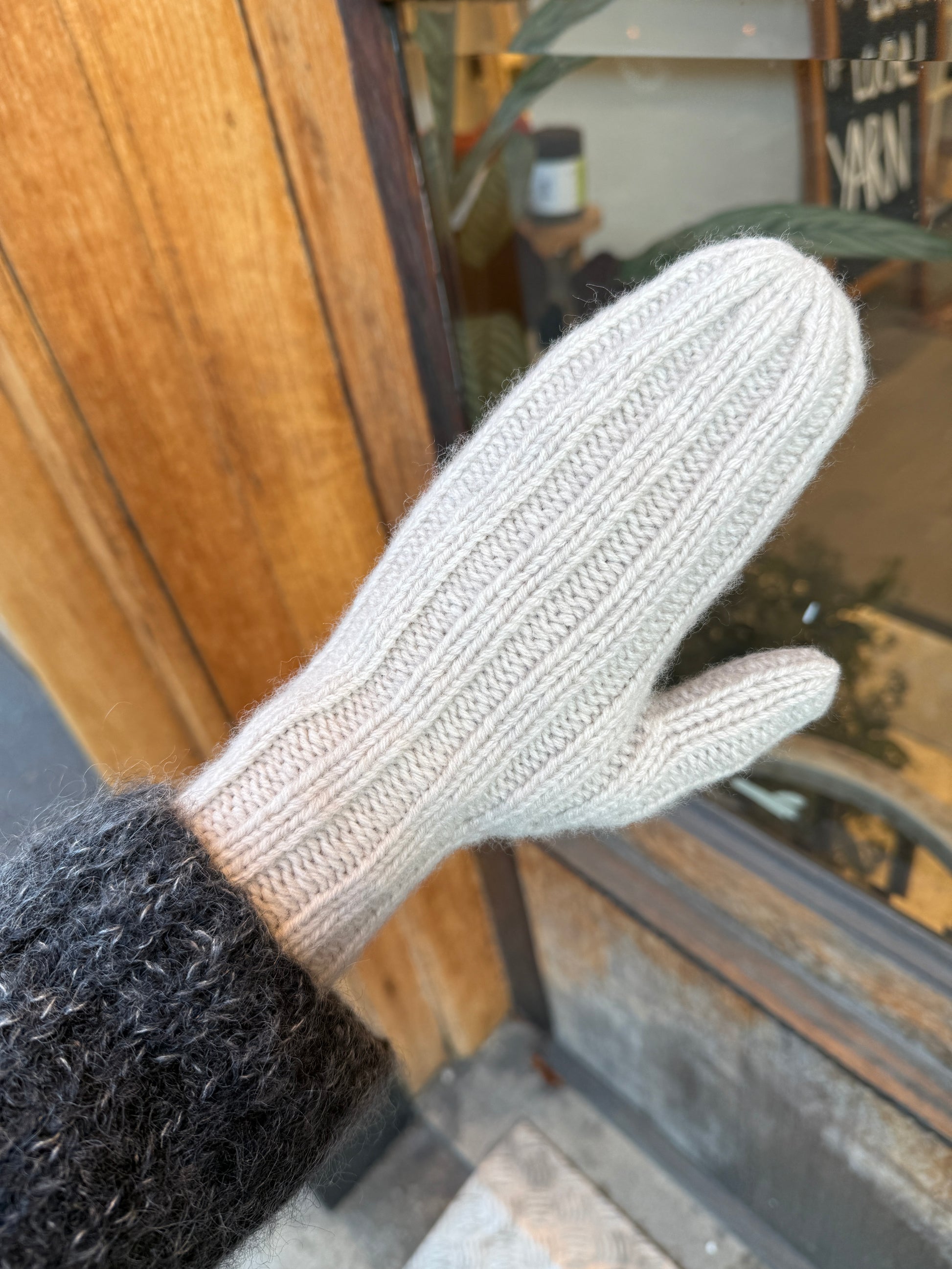 Den lyse votten er strikket i Como, farge 03 Silk Grey Melange, str. 1.