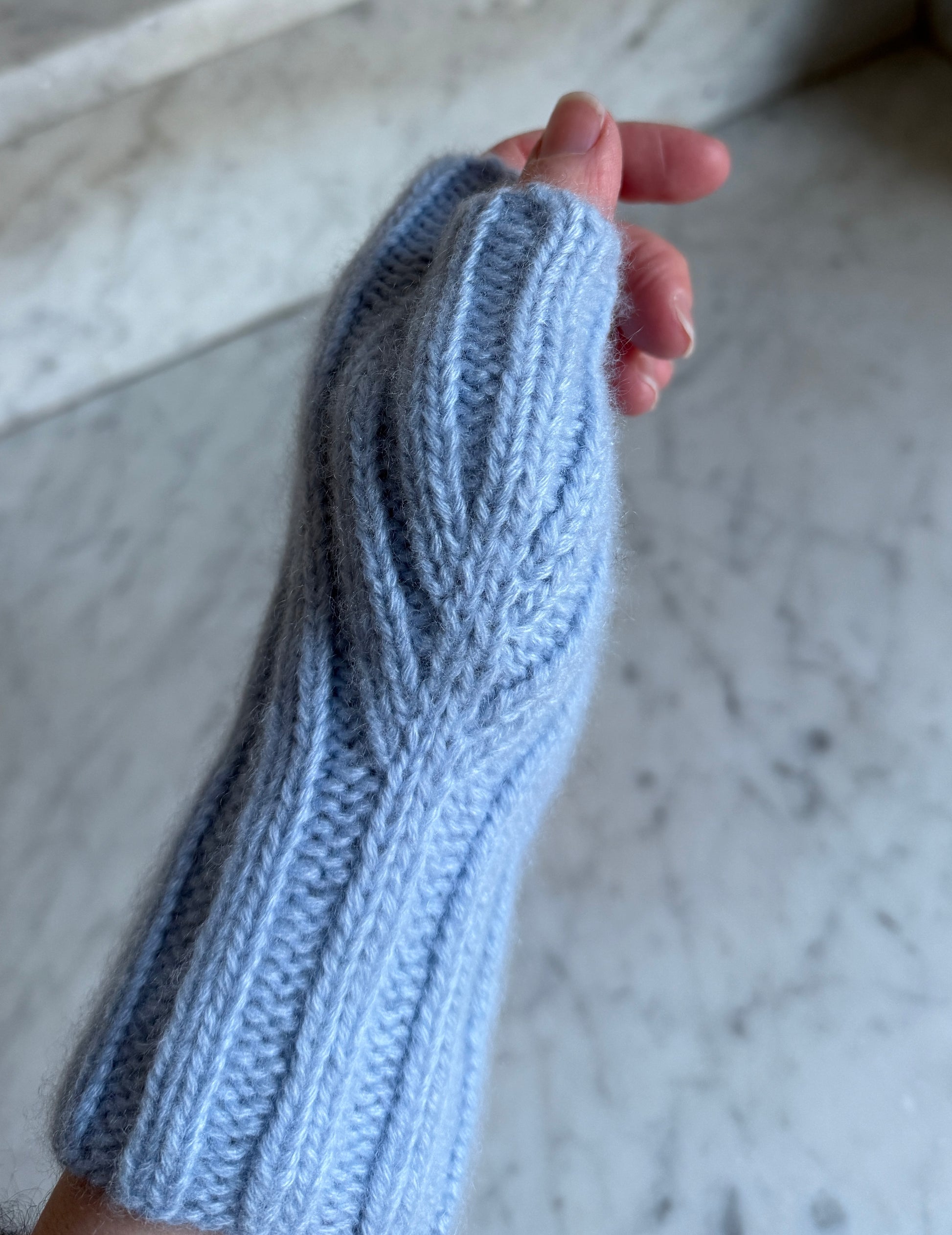 Den lyseblå pulsvanten er strikket i Cashmere Classic, farge 644 Baby, str. 2.